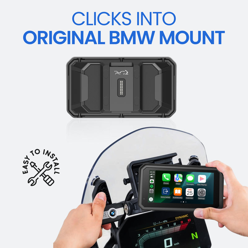 The MotorTablet Pro Max BMW is designed to fit all motorcycles that have the original BMW mount attached. It securely clicks into the mount, providing a very easy installation process of only a second, while still providing a very secure hold.