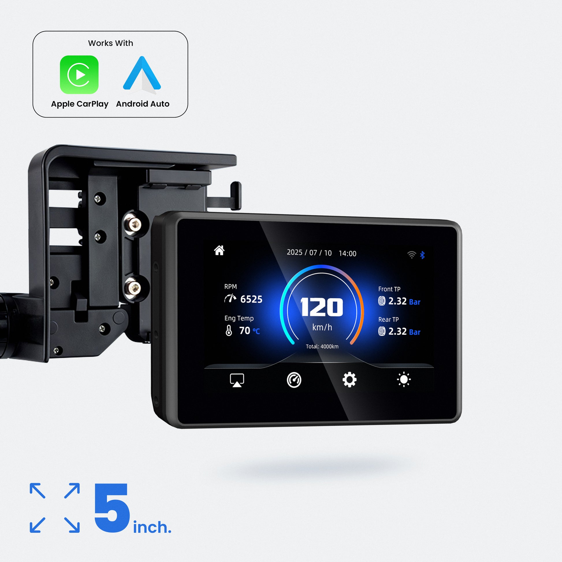 Read your speed, RPM, trip distance, engine temperature and way more on your MotorTablet BMW 5 inch!