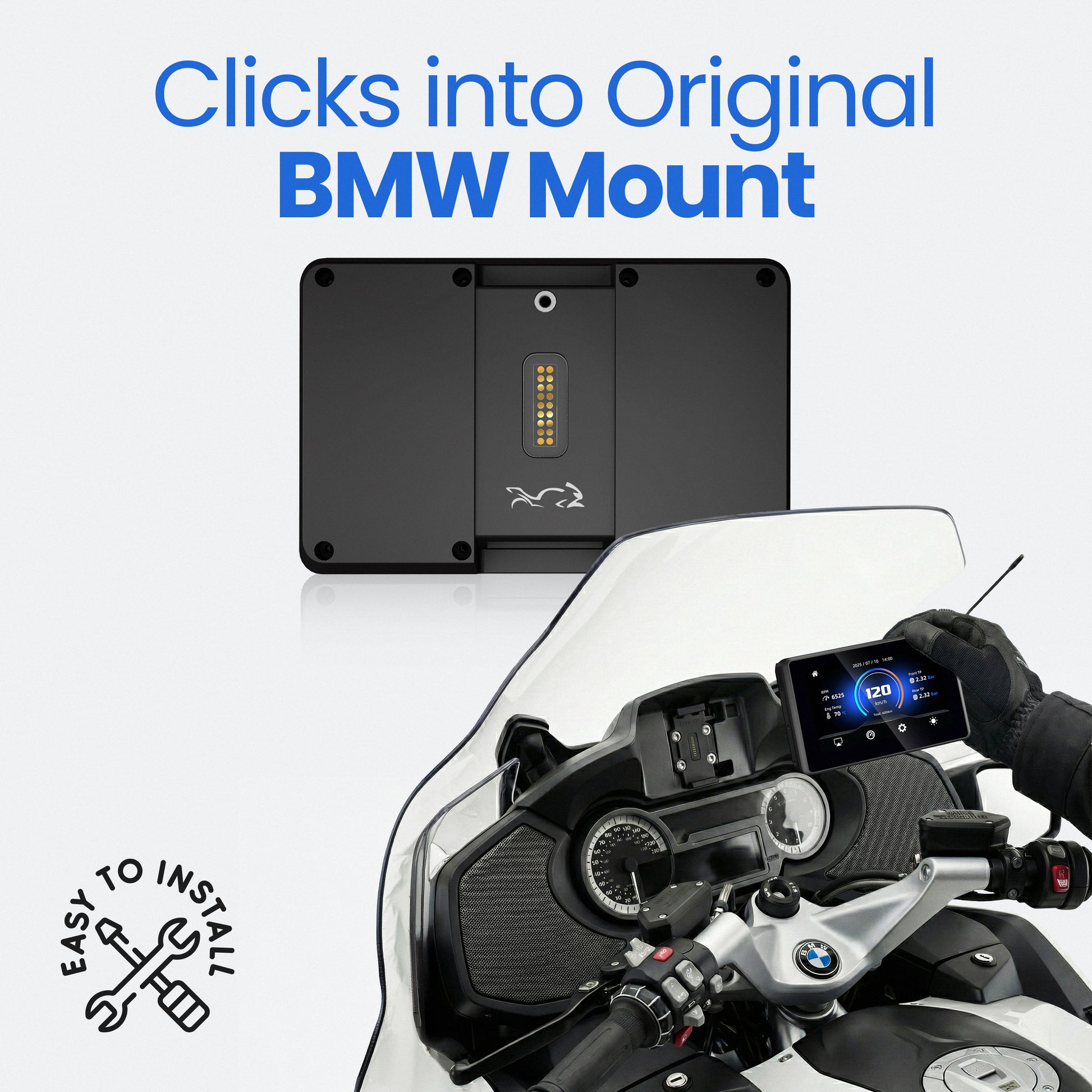 The MotorTablet BMW 5 Inch is designed to fit all motorcycles that have the original BMW mount attached. It securely clicks into the mount, providing a very easy installation process of only a second, while still providing a very secure hold. You can use our compatibility checker at the top of the page, so you can see if your BMW model is compatible.