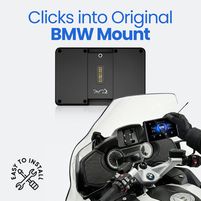 This compact version clicks directly into your factory BMW Nav mount and brings full Apple CarPlay and Android Auto to your bike, without any phone mounts, wires, or modifications.