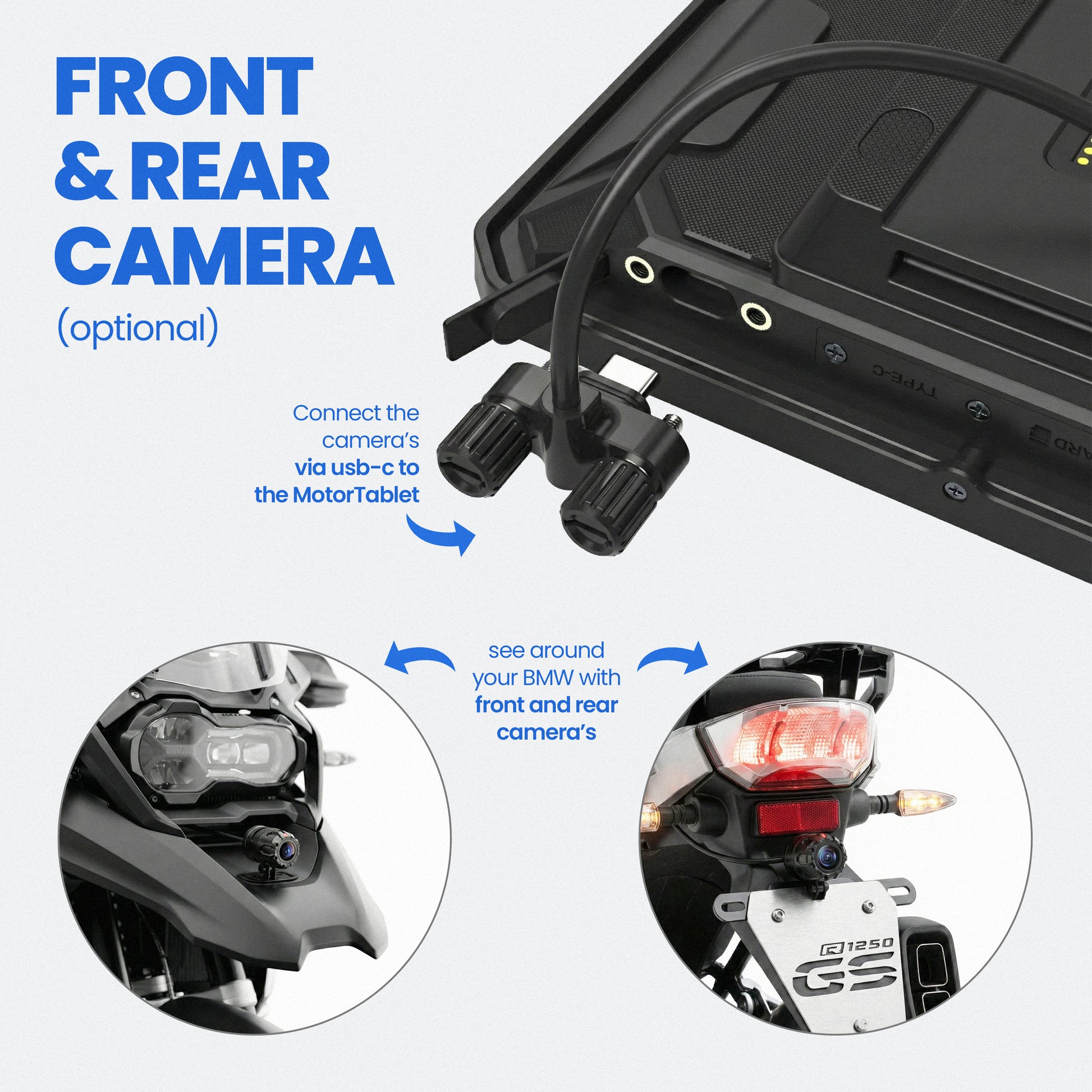 With the MotorTablet USB-C Camera System, you can finally record your rides, without tearing your bike apart. There is no need to wire the camera's to your battery, since we have designed a revolutionary system that connects the camera's straight to your motortablet with USB-C.