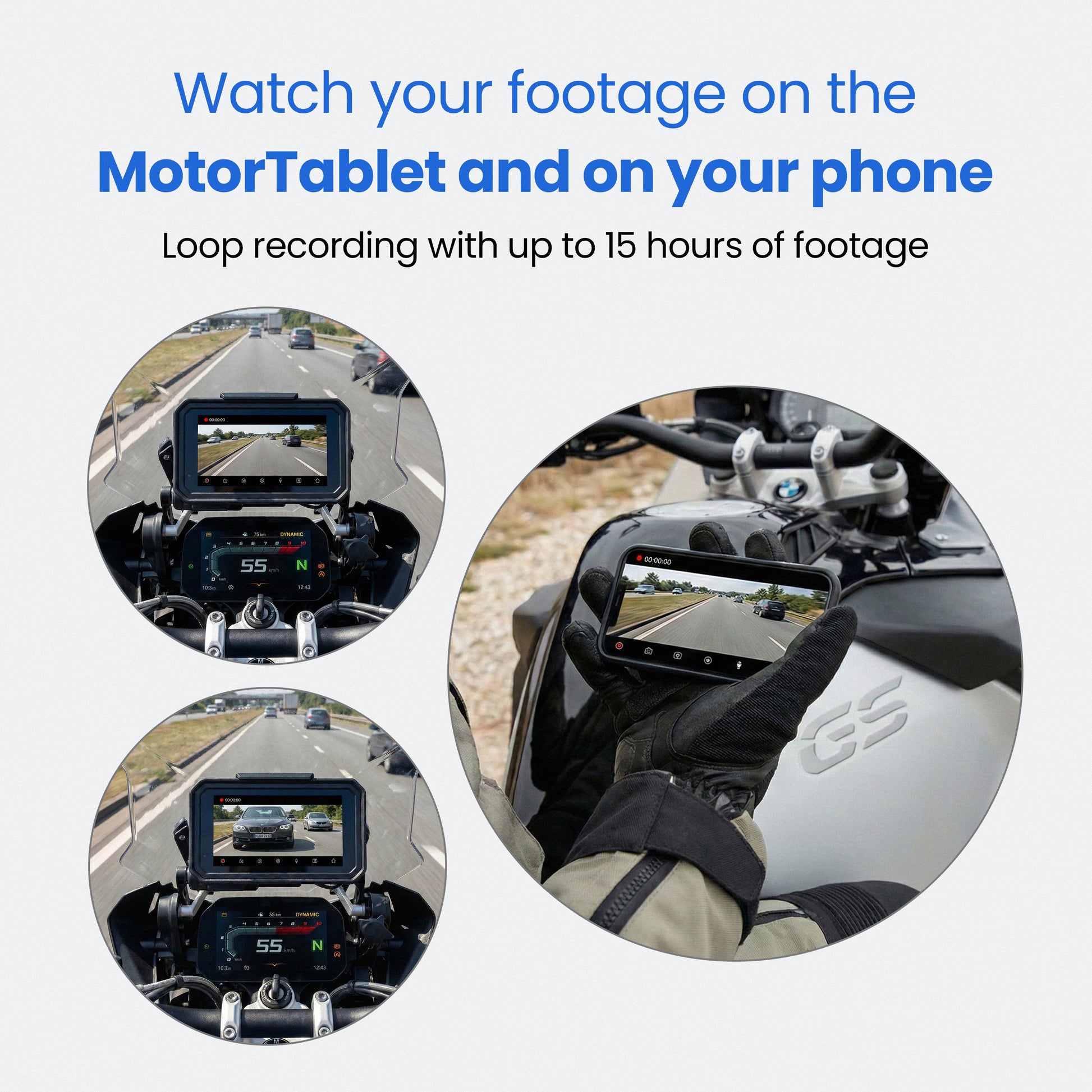 - See everything in real time. View live footage from your front and rear camera directly on your MotorTablet screen. Perfect for traffic, tight turns, or peace of mind.